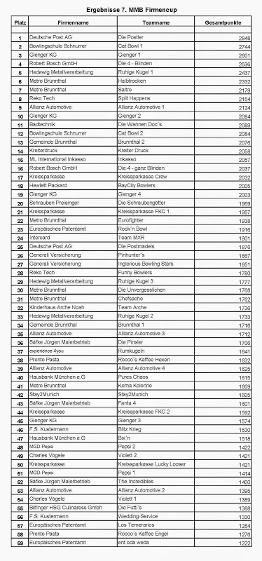 Durch den überraschenden Titelgewinn des 6. Firmencups auf der Isarbowling war das Ziel auch wieder hochgesteckt, insbesondere weil das favorisierte Team um Probst Büromöbel mit dem Landesligaspieler Marco Probst wieder teilnahm. Die Entscheidung um den Titel fiel im letzten Frame des Turniers um lediglich 5 Pins. Der 2. Platz für das Team Cat-Bowl in der Besetzung Martin Küchler, Maximilian Kammermeier, Klaus Kammermeier und René Weidlich ist als Erfolg und Bestätigung des letztmaligen Ergebnisses zu werten. Erfreulich zu bemerken ist, dass Maximilian Kammermeier, sich als bester Spieler bei den Herren denkbar knapp (3 Pins) vor Marco Probst platzieren konnte. Kompletiert wurde das gute Ergebnis durch Sandro Funke, der ebenfalls teilnahm und in der Herrenwertung den 3. Platz erreichte. Gratulation an Maximilian und Sandro für diese Leistung.